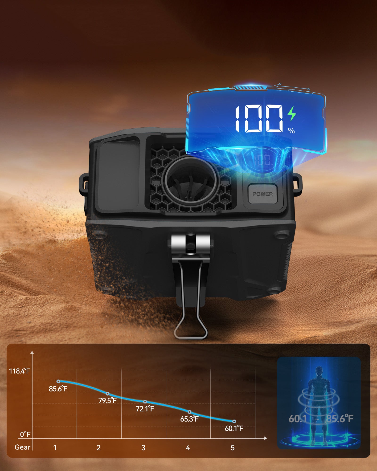 Know your battery level at a glance—no more guessing. The clear LED screen lets you monitor remaining power and fan speed in real time, so you stay in control and cool with confidence all day long.
